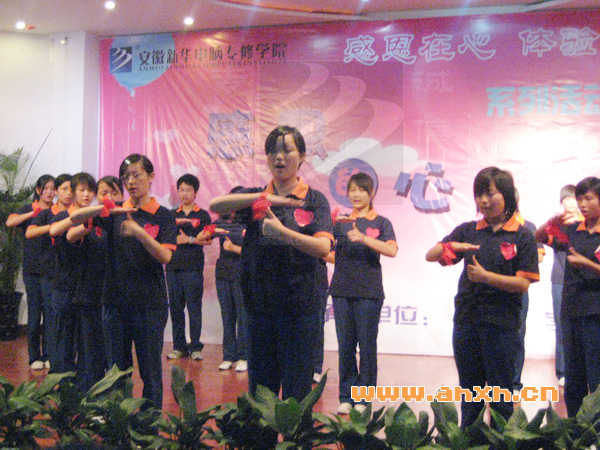 6月8日下午,我院西区多功能厅灯光闪烁,掌声不断,来自中专部9个班级的近千名学生齐聚一堂,共同观看了感恩的心系列活动之“感恩的心”手语总决赛的表演,安徽新华电脑专修学院常务副院长束开俊、计算机管理中心兼考试中心主任王胜、西区主任张荣福等其他相关领导出席并观看了表演。