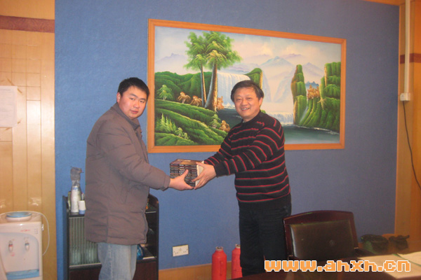 安徽青年报社社长、省青年新闻工作者协会副主席韩阳向新华赠送书籍