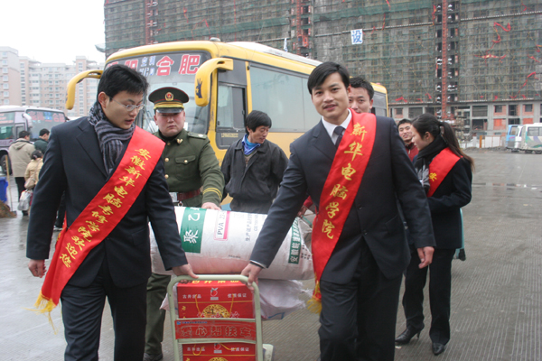 每年在客流高峰期的时候,安徽新华电脑专修学院都会开展志愿服务。为疲劳的旅客送上一杯水;搀扶行动迟缓的老人上车、过马路;为行李多的旅客拿行李;同学们还协助交警大队散发宣传单,倡导每位乘客文明乘车;为旅客指引道路;清理沿途杂物,维护车站卫生……在同学们的努力下,候车环境、上车秩序等情况大为好转。