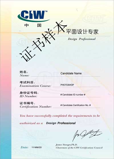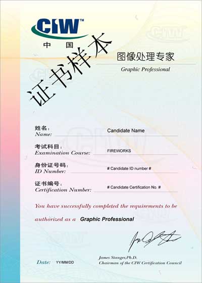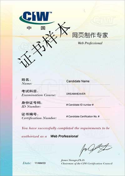 注:以上每门课程通过后可获得美国 VCampus 公司颁发的网页设计类分证书一张,通过三门(Fireworks 与 Photoshop 任选一门)后可获得 CIW 网页设计师总证书。