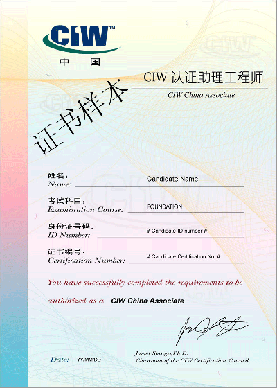 CIW(Certified Internet Webmaster),是全球最具权威地位的超越厂商背景的互联网证书。该证书认可了 IT 行业中担任网络管理、安全管理、站点设计、站点开发及Java程序员等职务的专业人员的职业技能资格。 CIW认证得到了互联网专家协会(AIP)、国际网站管理员协会(IWA)、国际互联网证书机构(ICII)、美国国家新兴技术职业资格中心(NWCET)、香港计算机协会、新加坡国家 infocomm 资格中心的认可。