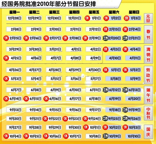 > 2010年中秋国庆假期时间安排 一个月分8断(图)