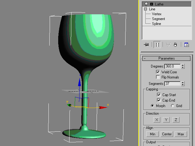 5、退出次物体编辑,为其添加Lathe修改器,设置合适的分段勾选Weld core,完成最后效果