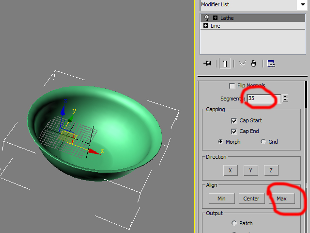 6、退出次物体编辑模式,为对象添加Lathe,设置Align方式为max,Segments=35,勾选Weld Core