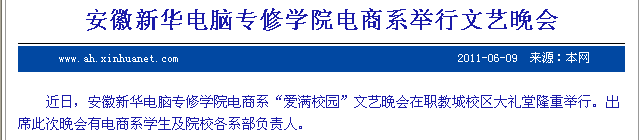 新华网讯 近日,安徽新华电脑专修学院电商系“爱满校园”文艺晚会在职教城校区大礼堂隆重举行。出席此次晚会有电商系学生及院校各系部负责人。