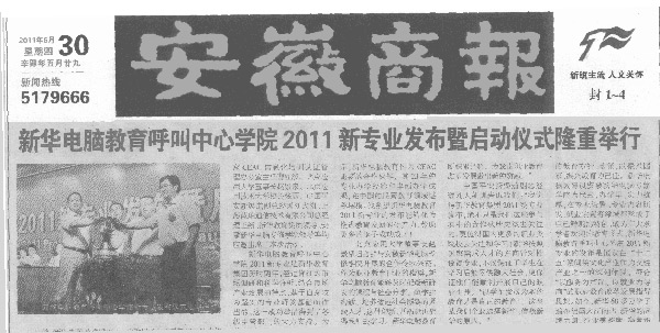 《安徽商报》报道:新华电脑教育呼叫中心学院2011新专业发布暨启动仪式隆重举行