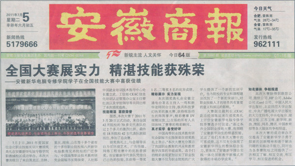 7月2日,2011年度国家信息化职业技能实训大赛颁奖典礼在安徽新华电脑专修学院职教城校区成功举办。本次大赛共吸引了来自黑龙江、吉林、重庆、湖南、山东等十多个省市的十多所职业院校和八所新华电脑教育兄弟院校的广泛参与。中国高等职业技术教育研究会副秘书长陈保荣、人社部中国就业培训技术指导中心处长董立武、工信部CEAC信息化培训认证管理办公室主任曹红泼以及行业精英、大学教授、大赛评委、学院领导一同出席了本次颁奖盛典并为获奖学子颁奖。技能精湛 喜获荣誉