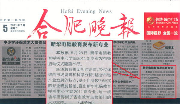 《合肥晚报》报道:新华电脑教育呼叫中心学院2011新专业发布暨启动仪式隆重举行
