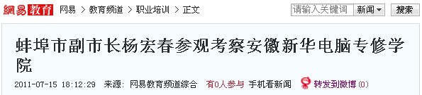 网易教育讯 近日,蚌埠市副市长杨宏春一行来到安徽新华电脑专修学院合肥职教城校区,参观考察职教城校区的建设情况、硬件配套设施以及学习新华特色的理论一体化教学新模式。安徽新华电脑专修学院领导以及教职员工代表热烈欢迎杨副市长一行的到来。