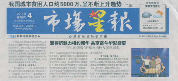 8月1日,“奋斗的青春”新华杰出校友颁奖盛典在安徽新华电脑专修学院职教城校区成功举办。著名表演艺术家、北京人民艺术剧院副院长、新华电脑教育形象大使濮存昕先生,安徽省政协常委、新华教育集团董事长吴俊保先生,新华教育集团领导、安徽新华电脑专修学院领导一同出席了颁奖盛典并为获奖学子颁奖。中央电视台、安徽电视台、成都电视台、徐州电视台、、新安晚报、合肥晚报、安徽商报、市场星报、江淮晨报、新华网、中安在线、安青网、合肥热线、腾讯大成网、新浪微博等20多家媒体报道了本次颁奖典礼盛况。
