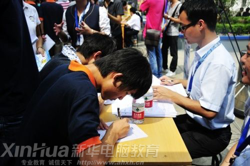 前来应聘的新华学子正在填写录用表格