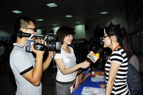前来招聘的用人单位正在接受合肥电视台记者的采访