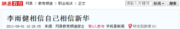 网易教育讯 初次接触李雨建的资料,上面醒目的写着:李雨建1989年出生于宣城,新华2006届高级全能专业毕业,就职于上海得搜网络科技有限公司,职位市场总监,年薪15万。后来采访中,他特意纠正说资料错误,那是自己去年的资料了,自己已于2009年3月份创办了安徽中一网络科技有限公司。