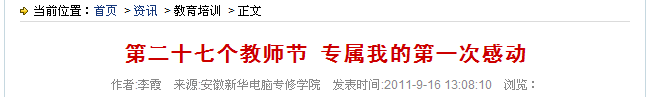 安徽新华电脑专修学院教学负责人在接受采访中提到,“我院广大教师献身教育、爱岗敬业、勤奋工作、无私奉献的高度责任感和在平凡工作中显示的伟大精神令人深受感动。我院也涌现出了一大批业务精湛、师德高尚的优秀教师,一批风华正茂的中青年教师正在成长,有力地推动了全省职业教育事业的发展,为我省经济持续快速协调发展提供了强有力的人才支持。同时希望教师要树立先进的教育理念,成为素质教育的引路人;要坚持以德化人,成为人类魂的工程师;要坚持终身学习、率先学习,成为IT技能教育的传播者。”