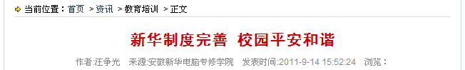 9月初,是新生报名老生返校的高峰期。作为中国IT教育十大影响力品牌的安徽新华电脑专修学院一直把校园安全工作作为学院的重点工作之一。记者在位于省城合肥市职教城的安徽新华电脑专修学院看到,校园内一片温馨、祥和的校园氛围展现在记者面前。