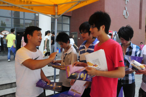 现场报名工作人员正在向前来报名咨询的新华学子介绍报名要求