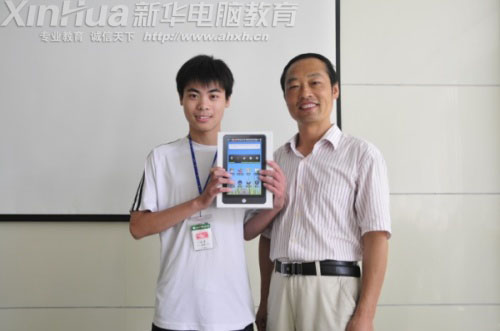 安徽新华电脑专修学院副院长孙礼平向唐睿同学颁发“平板电脑”一台