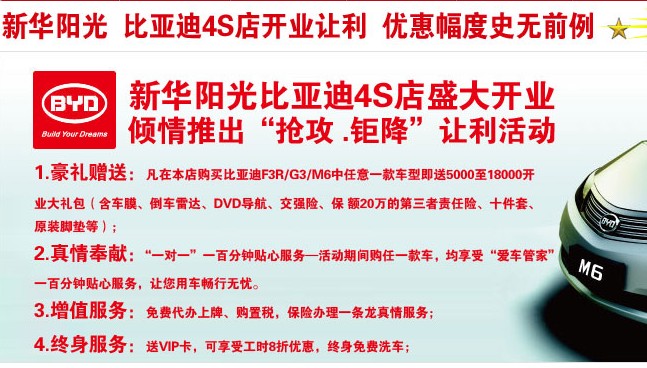 1. 豪礼赠送:凡在本店购买比亚迪F3R/G3/M6中任意一款车型即送5000至18000开业大礼包(含车膜、倒车雷达、DVD导航、交强险、保 额20万的第三者责任险、十件套、原装脚垫等);
