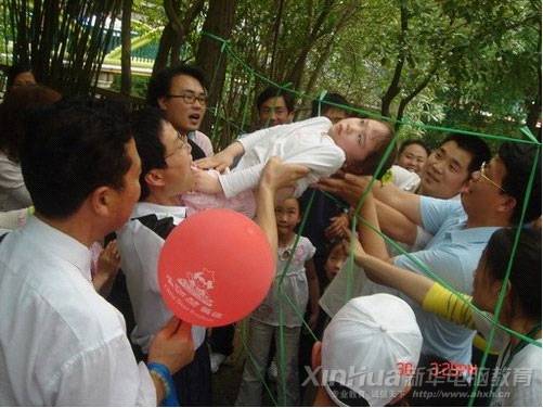 四.详细游戏规则:在两棵树之间用绳子织起的网,有大小形状都不规则的十九个洞口,假想为有高压的网丝,在规定的时间内,队员要互相配合在不碰触到网子的情况下全部穿过去,并且穿过的洞口不能再过人,而碰到“高压网”就表示任务失败,需要重新再来。在接到任务后,队长和队员充分发挥大家的智慧,广纳建议,制定穿越计划,共同协商协作,把每个人或抬着或扛着安全送过网洞,每次的成功换来的是大家的欢呼雀跃,最后所有的队员都顺利穿过了“生死网”。