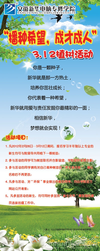 所以值第34个植树节到来之际,安徽新华电脑专修学院特推出“播种希望,成才成人” 植树育才活动,活动具体内容如下: