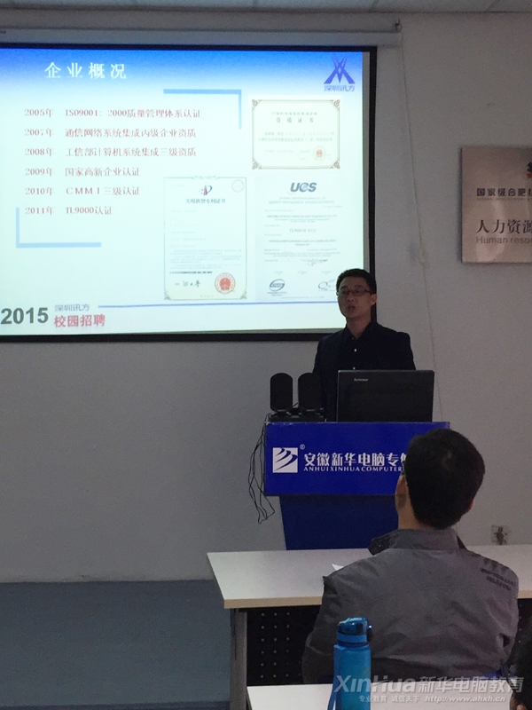 安徽新华电脑专修学院是国家信息化教育全国示范基地、中国电脑教育十大影响力品牌院校,主要从事广告设计、装饰设计、电子商务、软件开发、网络工程、动漫游戏、数码影视、信息工程等计算机应用专业的教育。 近年来着重加强专业技术和管理人才队伍建设,提升教育教学管理水平,本着以加强学生专业技能与实际动手能力为宗旨,结企业对人才的需求,全面制定卓有成效的教学计划进行教学工作,培养学子们的专业技能、实际动手能力;同时对我院毕业生在职业规划、综合素养等方面都得到了全面提升,德才兼备的培养模式,得到很多企业的青睐与认可, 2014年10月,深圳市讯方通信技术有限公司慕名前往我院进行了优秀毕业生的选拔招聘。