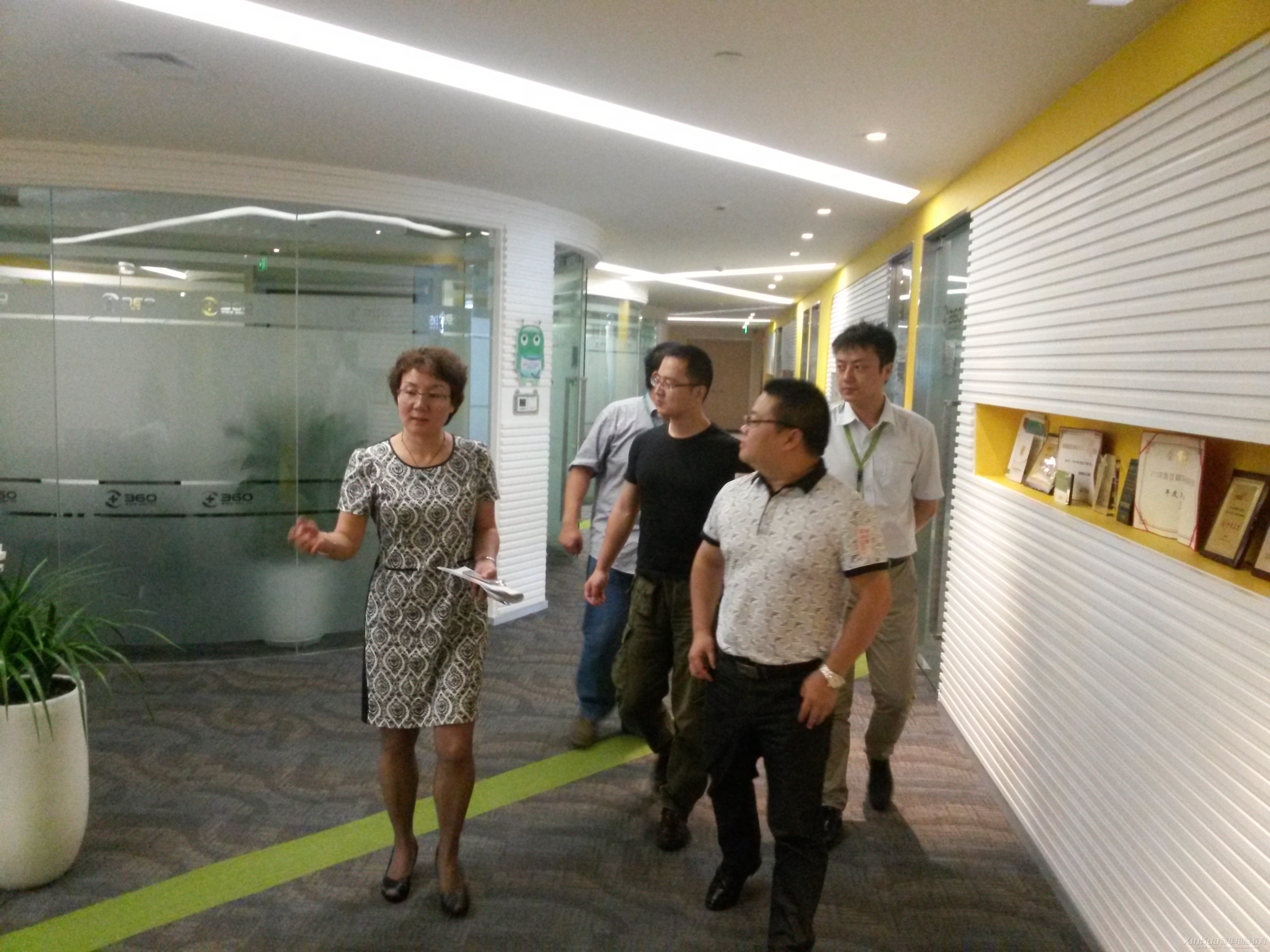 随后,吴院长一行又参观了360员工休息区。这里环境优雅舒适,精致的座椅,丰富的饮料,营造出轻松、休闲的氛围。工作繁忙之余来这里放松小憩,再泡上一杯咖啡或者香茶,不失为一种劳逸结合的享受。在360公司的墙壁上,也随时能见到彰显企业轻松文化的标识。比如“我们希望与这些优秀的小伙伴为伍”系列,通过生动有趣的360卡通漫画,展现了企业丰富的文化和准则。吴院长一行对360公司的文化建设和氛围,深表赞许。