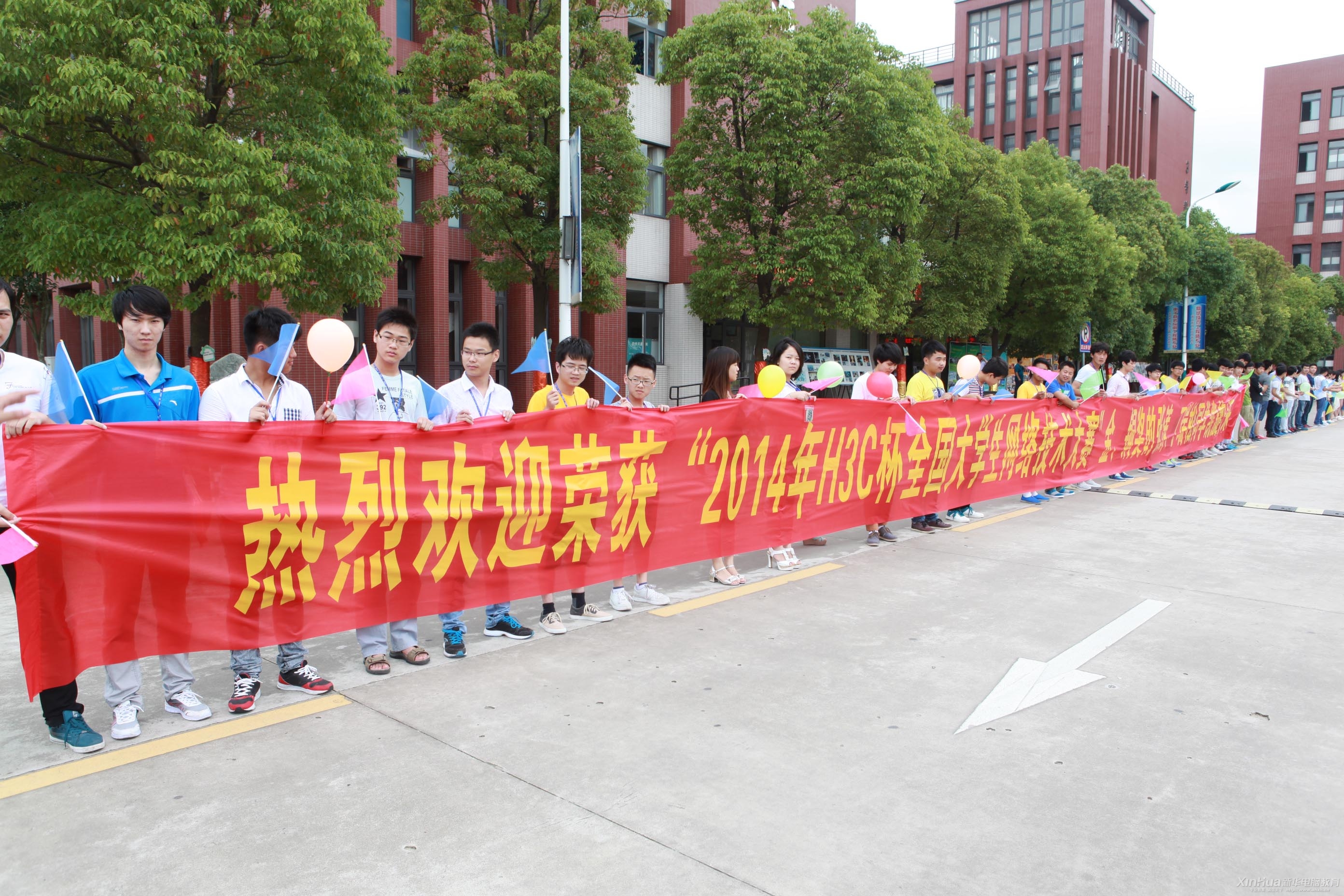 安徽新华电脑专修学院一派喜庆隆重的氛围。在“H3C杯”2014全国大学生网络技术大赛中分别荣获金奖、铜奖的新华学子张涛、丁瑞松以及两位带队老师余旭伟、姚育生载誉归来,受到了全校师生的热情接待。