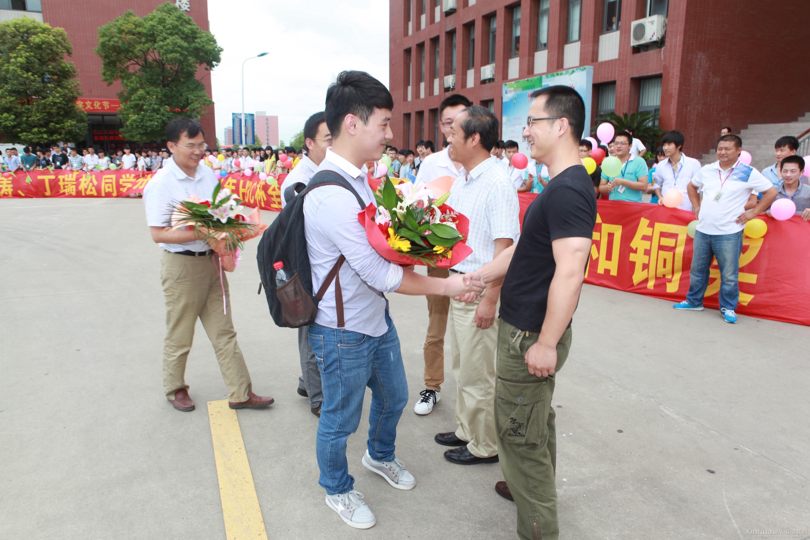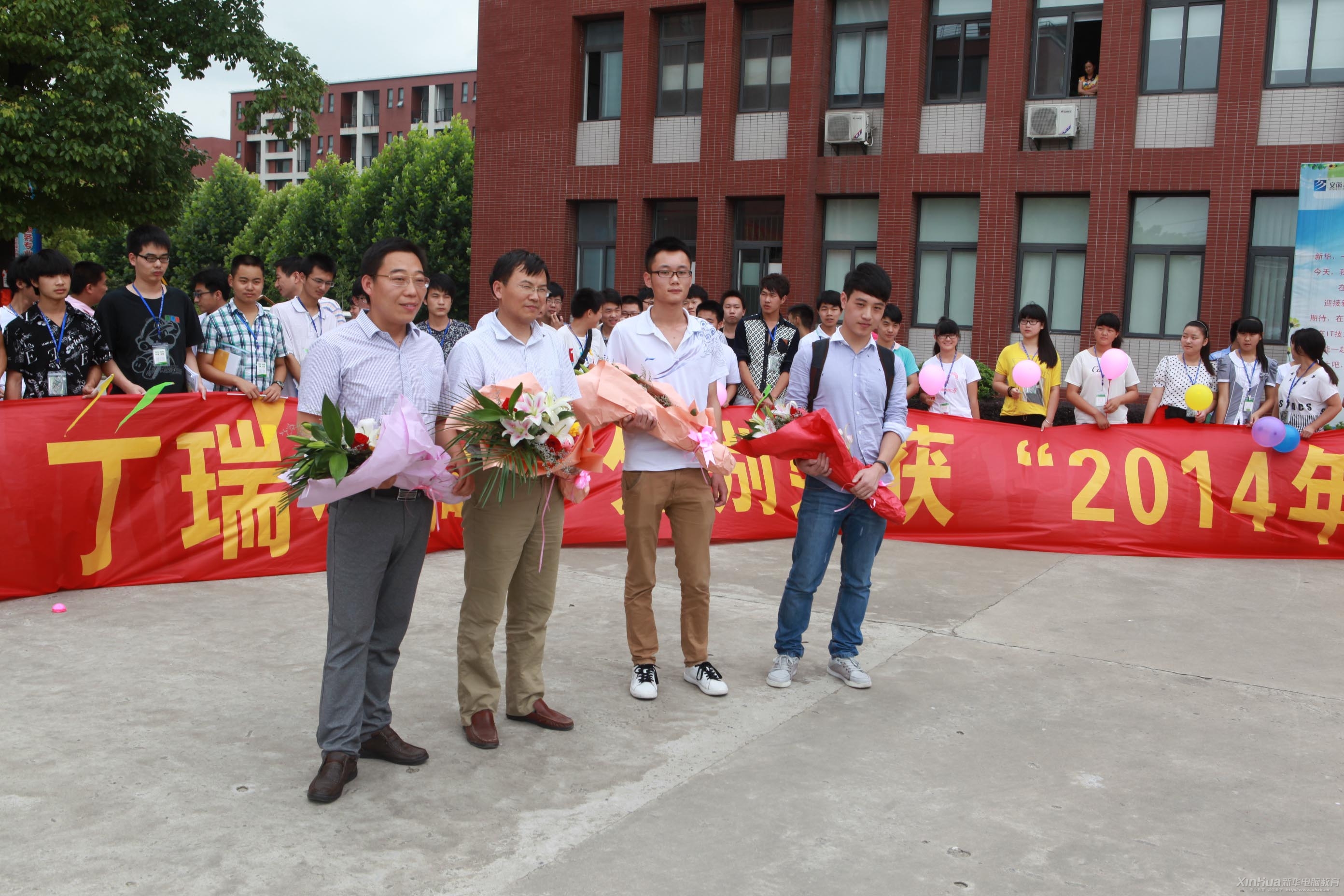 现场学子排着整齐的长队,手持长长的横幅以及鲜艳的彩旗、气球,等待学子的归来。伴随着一阵清脆的鞭炮声,获奖学子张涛、丁瑞松以及带队老师余旭伟、姚育生从车上下来,学生代表手捧美丽的鲜花,为他们送上祝福。随后,四位获奖老师和学生沿着欢呼队伍,伴随着一路的欢呼声,来到综合楼前接受