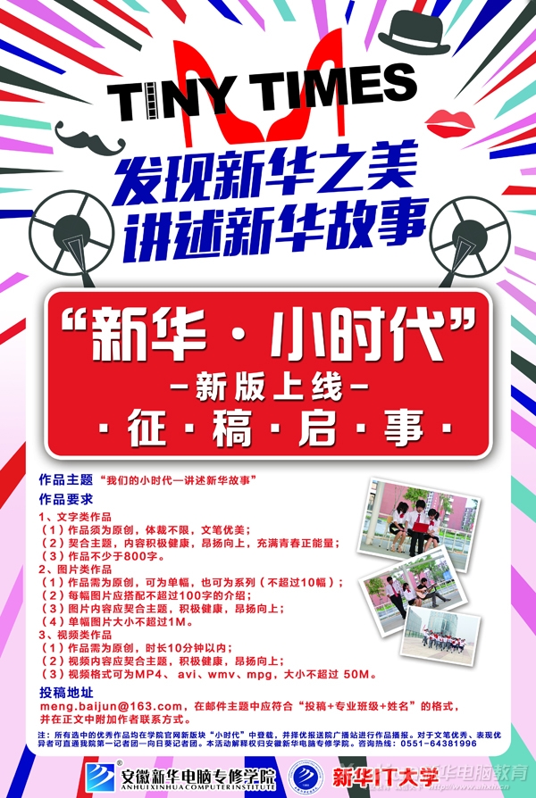 为展现新时代下安徽新华电脑专修学院学子积极向上的精神风貌,凸显新华学子丰富多彩的学习生活,让每一位学生充分展示自己的才华,经学院领导研究决定,将在安徽新华电脑专修学院官网开辟“新华·小时代”这一崭新的版块,直接面向广大学生群体。同时,为更加贴近时代特点,将在贴吧、微博、微信等新媒体平台陆续开通服务。感受IT生活,传播正能量!
