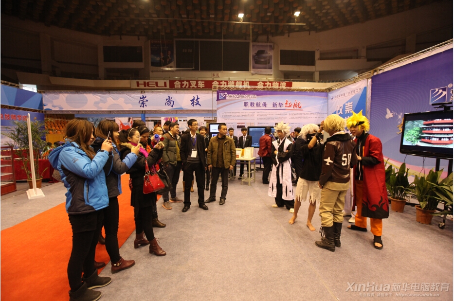 安徽新华电脑专修学院展区准备了新华学子精心编排的cosplay秀,各种炫酷的造型和个性装扮让来往的年轻人驻足观赏拍照纪念,超大屏幕配备的体感游戏机让新华学生现场欢乐互动,更有许多参观者跃跃欲试,陶醉在逼真的游戏场景中。