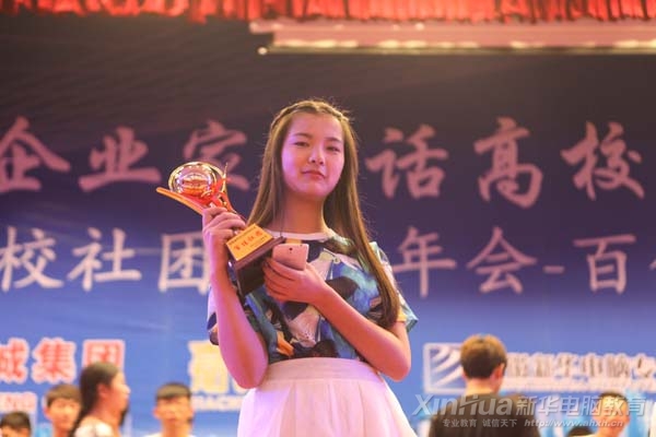 领取奖杯的安徽新华电脑专修学院礼仪协会会长张茹