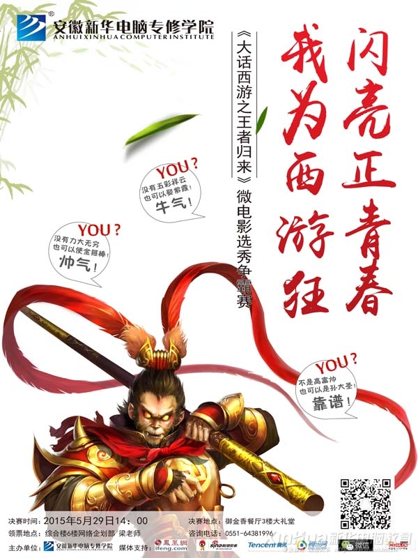 为配合《大话西游之王者归来》最大校园剧的决赛及开拍,5月29日晚学院各系部班级将组织“决赛观影季”微电影放映活动,届时将有一系列优秀、种类繁多的微电影连续放映,让你一饱眼福。