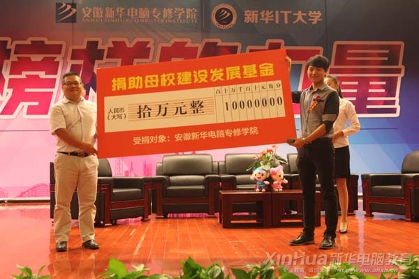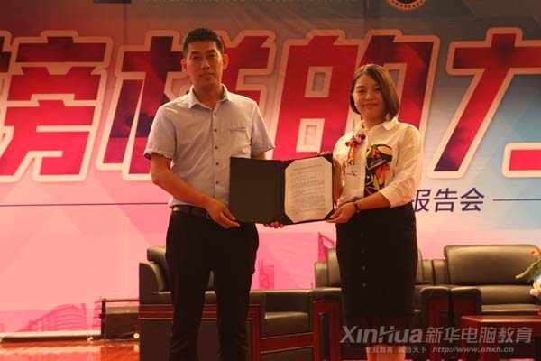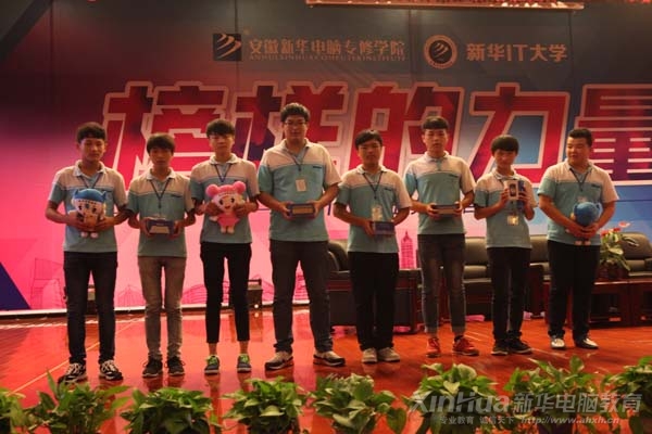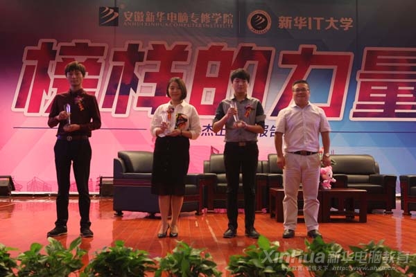 安徽新华电脑专修学院院长吴元红为杰出校友颁奖并合影留念