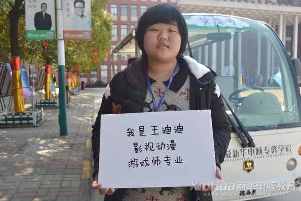她是来自安徽宿州的一位女生,她叫王迪迪,委婉含蓄的她今年17岁。高中单调的学习生活让她感到迷惘,她开始寻找新的人生出口。在一个偶然的机会下她认识了安徽新华,和父母商量后来到新华。因为自己有一些绘画基础和喜欢动漫,从而选择了影视动漫游戏设计师专业。学好自己的专业,重新书写自己的人生。她说:世上无难事,只怕有心人,只要努力就会成功。