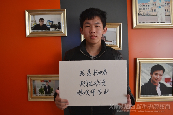 他是一位乐观、积极、善于交流的一个17岁青年,他叫杨啸,来自安徽芜湖,一个美丽的城市。在此之前他在社会上学习多年,曾经是广东某公司人事部管理的一员。因为不满现状,想要有一个更好的生活。他选择了安徽新华,学习影视动漫游戏设计师专业。他说学习就是为上班而服务,认真学习专业,一步一步向前走,不怕困难,就怕没有挫折。他这样对自己宣誓:我说过的事情,从来不会漏,一定会做到。