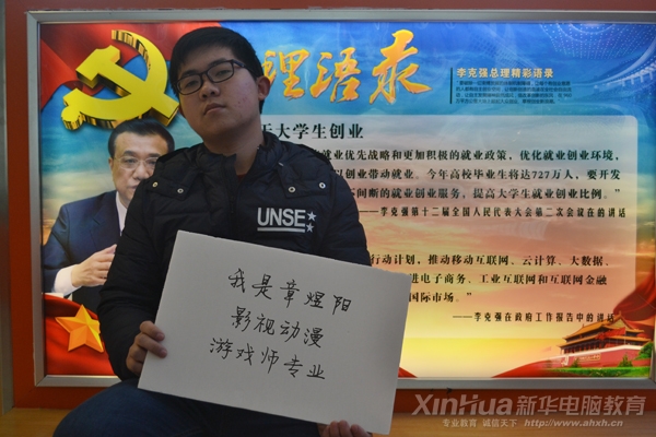 一个来自安徽安庆腼腆含蓄的小伙子章煜阳,17岁的他虽然没有结束他的高中生涯,但他并没有放弃对理想的追求,他从小喜欢就喜欢电脑,喜欢动漫和游戏。自己在网上看到安徽新华可以实现他的理想。在父母不同意的情况下毅然地选择新华,后来他的父母经过了解,同意了他的想法,并很支持他。他希望自己可以通过自己所学的专业成为一名游戏设计师。他对自己说:相信自己,只要努力,我能做到的而且比别人做的更好。