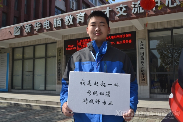 赵杨一帆他来自于安徽蚌埠,16岁后他虽然结束了他的学业,但他也为自己另想出路,通过他的兴趣爱好,不断地对比和筛选,最后在和父母的商量中来到了安徽新华,选择了影视动漫游戏设计师专业,喜欢动漫和游戏的他在这可以好好施展自己的理想,为自己的理想奋斗。他说他的事业可以像他的名字一样扬帆起航、一帆风顺。他对自己说:失败并不可怕,重要的是有一颗坚毅的心,并相信自己可以成功。