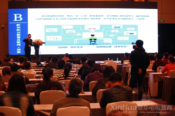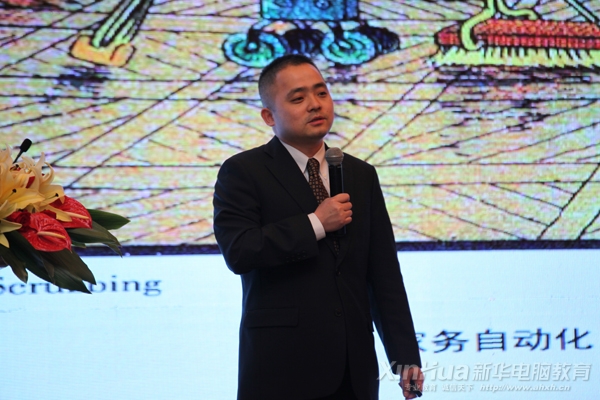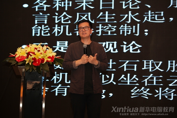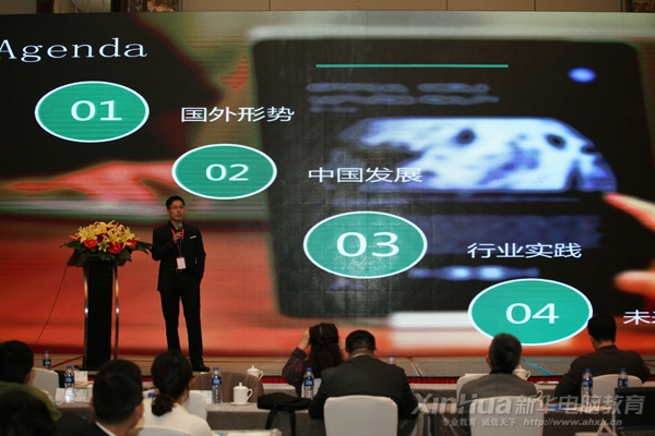 在这样的互联网+时代背景下,具有“教育”和“行业”双重属性的新华电脑教育处变不惊,从容应对,在新格局下,也做出了许多探索。高峰论坛上,新华教育集团副总裁沙旭对“利用互联网平台培养互联网实用人才”发表了主题演讲。从互联网+任务驱动五步教学,提升教学效果;利用互联网平台,让学生实践到实战;互联网助推高端人才培养等三个方面详细介绍了新华电脑教育在互联网变革教育的新形式下完整的人才培养方案。