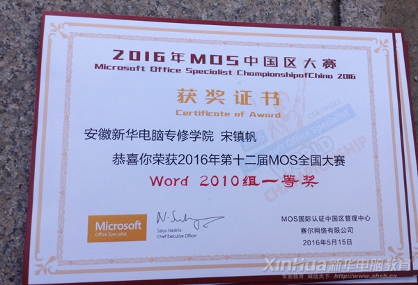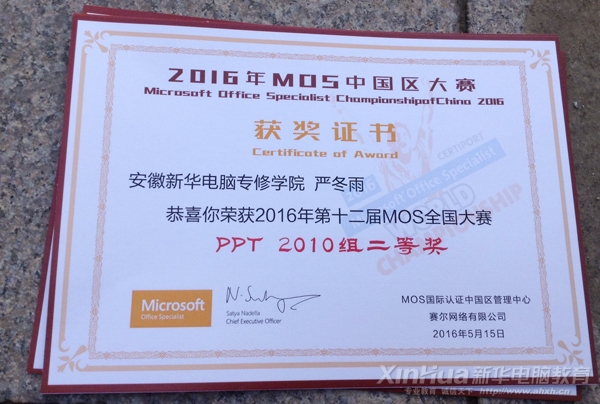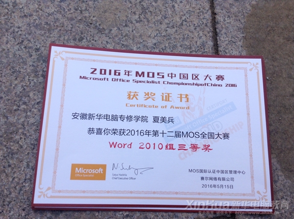 2016世界MOS大赛安徽新华学生部分奖状