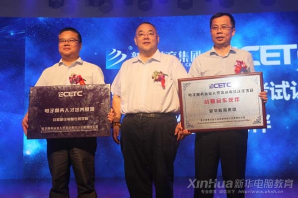 ECETC基地授予新华教育集团”电子商务从业人员培训考试认证项目战略合作伙伴”、授予安徽新华电脑专修学院”电子商务人才培养基地”荣誉牌匾
