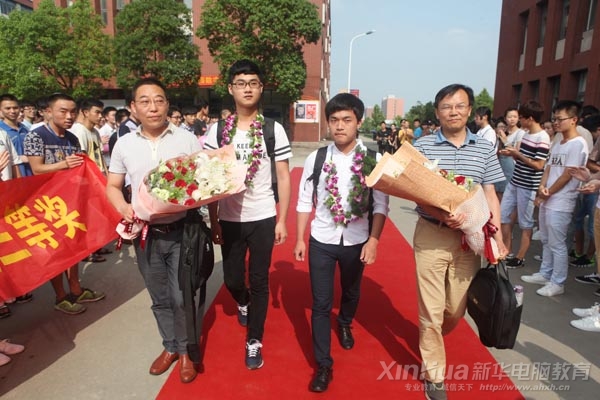 车笛声呼啸而至,伴随着迎接的红毯和队伍,获奖同学和指导老师刚出现,就被鲜花,花环,礼炮,气球还有雷动的掌声包围了起来。本次在“新华三杯”2016年全国大学生IT技术大赛中,两位新华学子以自己专业的只是沉淀和技能素养博得大赛一等奖和三等奖的佳绩。