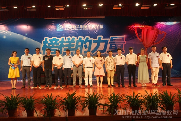 安徽新华电脑专修学院院长吴元红为杰出校友颁奖并合影留念