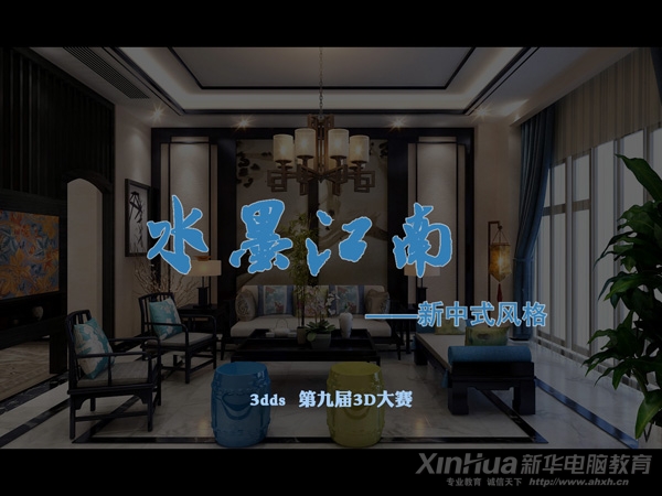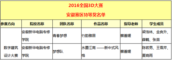 安徽新华电脑专修学院环境艺术学科蔡善媛老师指导的竹韵雅居、水墨江南——新中式风格两个作品一举拿下数字建筑设计大赛安徽赛区特等奖。