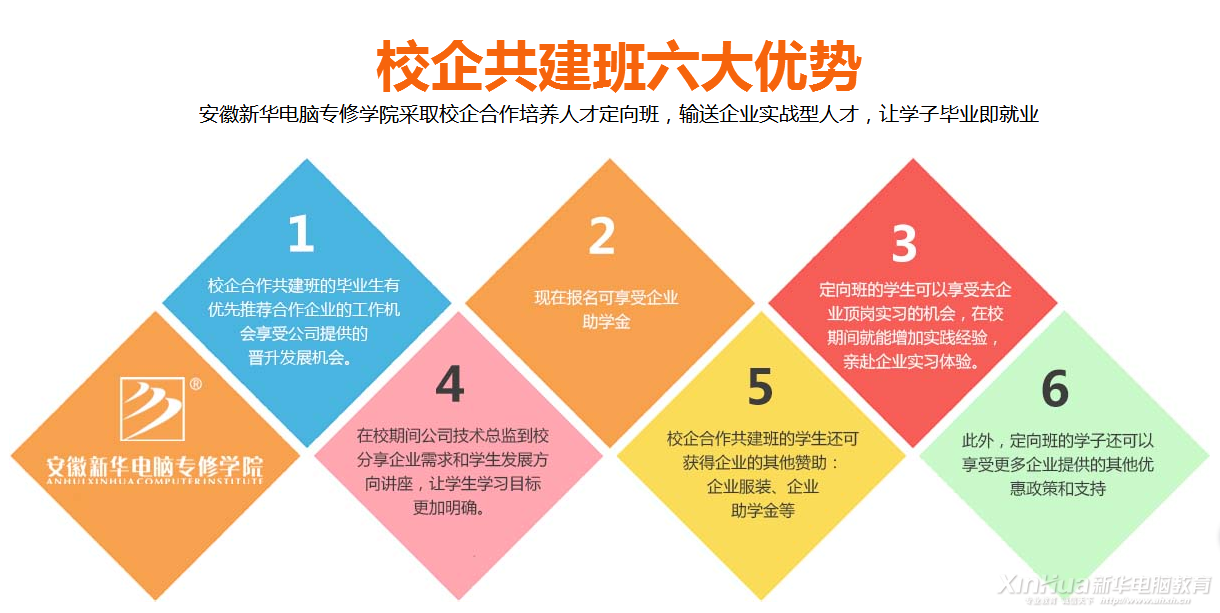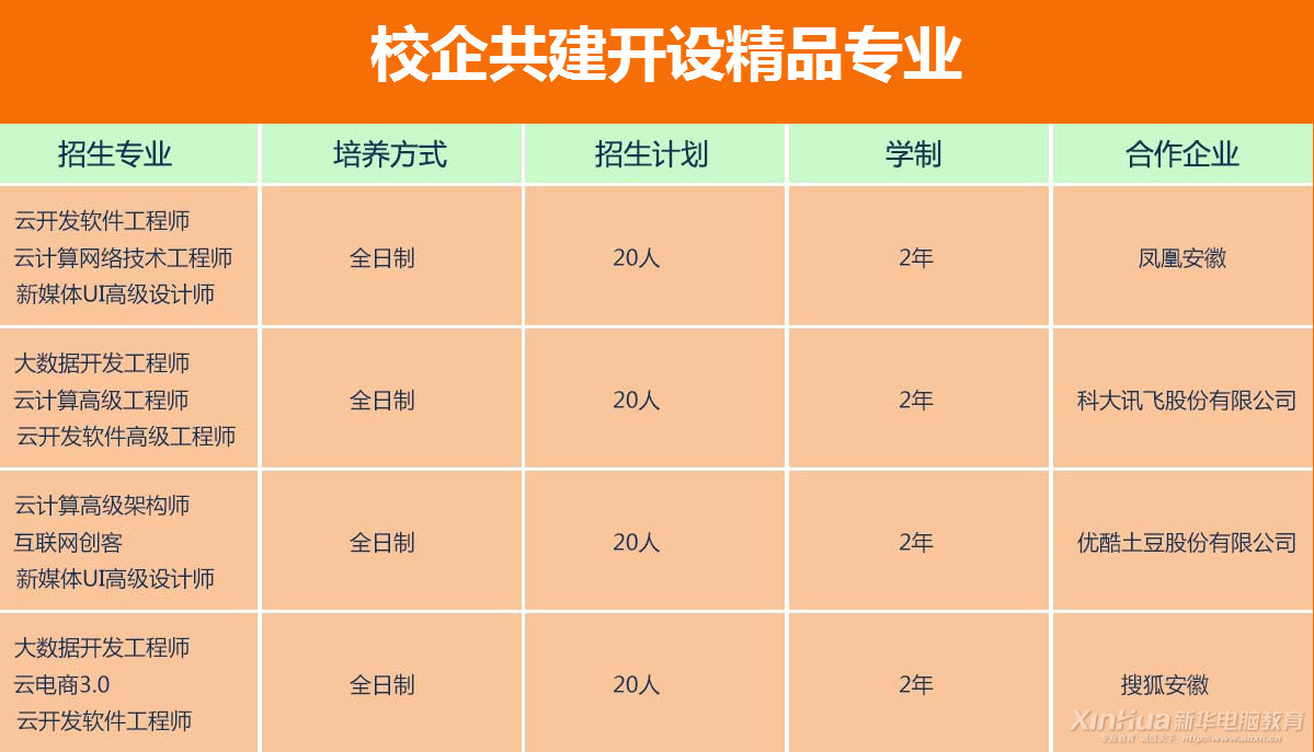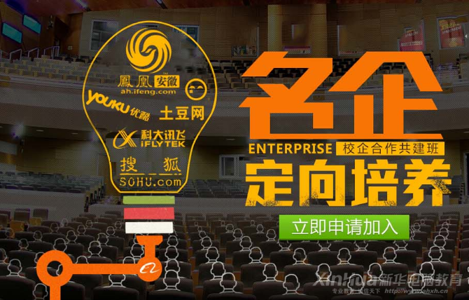 名企特招班,新华携手名企共筑未来。为了让我院学生获得更好的就业机会和发展前景,培养更多的互联网人才。安徽新华正式启动校企合作共建班招生(凤凰网、科大讯飞股份有限公司、优酷土豆股份有限公司、搜狐安徽),从1月18日起,报读安徽新华电脑学院校企合作共建班的学生即可享受优先就业、企业赞助、企业顶岗实习等机会。
