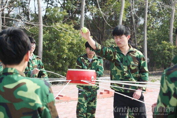不同于墨守成规的枯燥军训,本次军训新添了多种拓展项目。“鼓动人心”是一个团队合作项目,同学们的任务是通过学生牵引连接鼓的绳子,利用鼓面颠球。完成任务要求的颠球数额即为成功,进行下一项拓展。这就要考验团队之间的默契及力度掌控,在拓展的过程中,同学们培养了深厚的情谊。