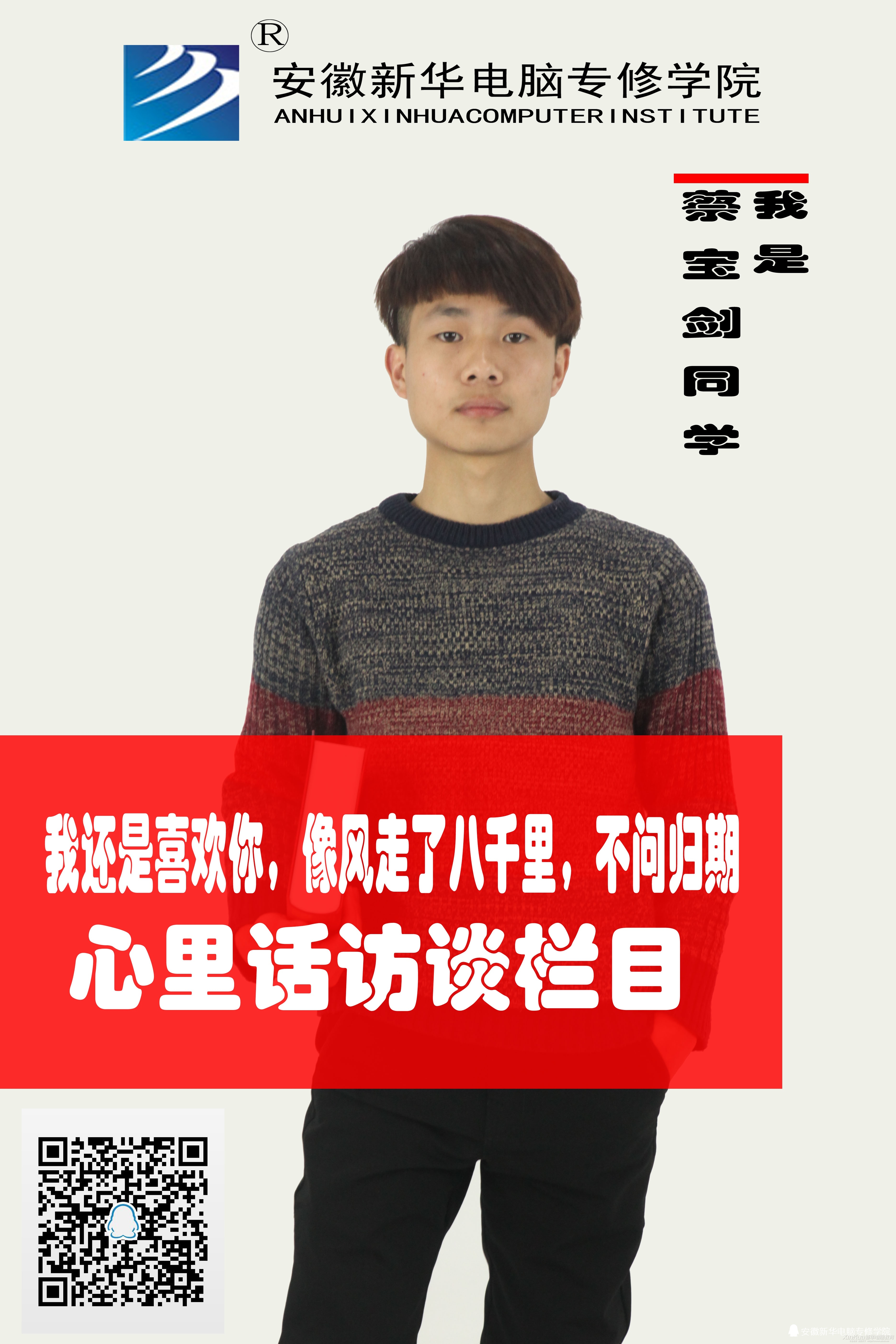 蔡宝剑说他最喜欢这句话,因为有些热爱与思念是距离无法阻隔的,恰如他对安徽新华。安徽新华电脑专修学院广告传媒专业的蔡宝剑来自江西赣州,一个距离合肥1000公里的地方,一个坐火车需要12个小时的地方,一个跟合肥完全没有交集的地方。但是蔡宝剑来了安徽新华。