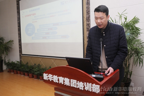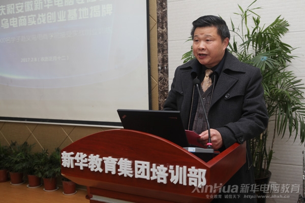 安徽省工商局市场监管处处长郑文宝发表讲话,郑处长表示:义乌电商作为全国乃至全球先驱,拥有最优越的电商氛围、名列前茅的电商产值、多形式高质量的电商集聚平台,新华结合当前社会发展趋势和义乌环境优势,选择义乌作为电商实训基地,这是明智且长远的一项决定。