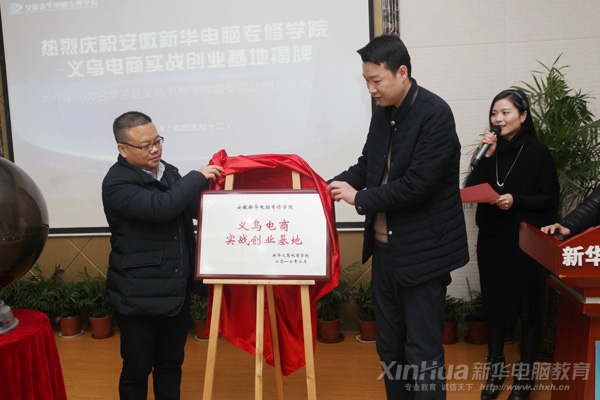 新华在近三十年的发展中,为社会输送了两百多万技术人才,“万人电商专才”培养计划是一次新的实践,是产学研深度融合的专业人才培养模式创新,开电商历史之先河。一个好的战略就是在正确的时机,选择正确的人,做一件正确的事情。在热烈的掌声中,安徽新华电脑专修学院院长吴元红、义乌电商学院院长费群等领导上台进行义乌电商实战创业基地揭牌,随着揭牌仪式的完成,本场仪式走向高潮。