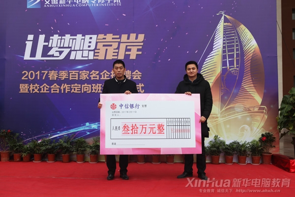 为响应国家关于加强校企合作的号召,更好地为社会培养高素质、高技能的应用型人才,充分发挥校方与企业的优势,2017年2月17日,“让梦想靠岸——2017百家名企招聘会暨校企合作定向班授牌仪式”在安徽新华电脑专修学院隆重举行。