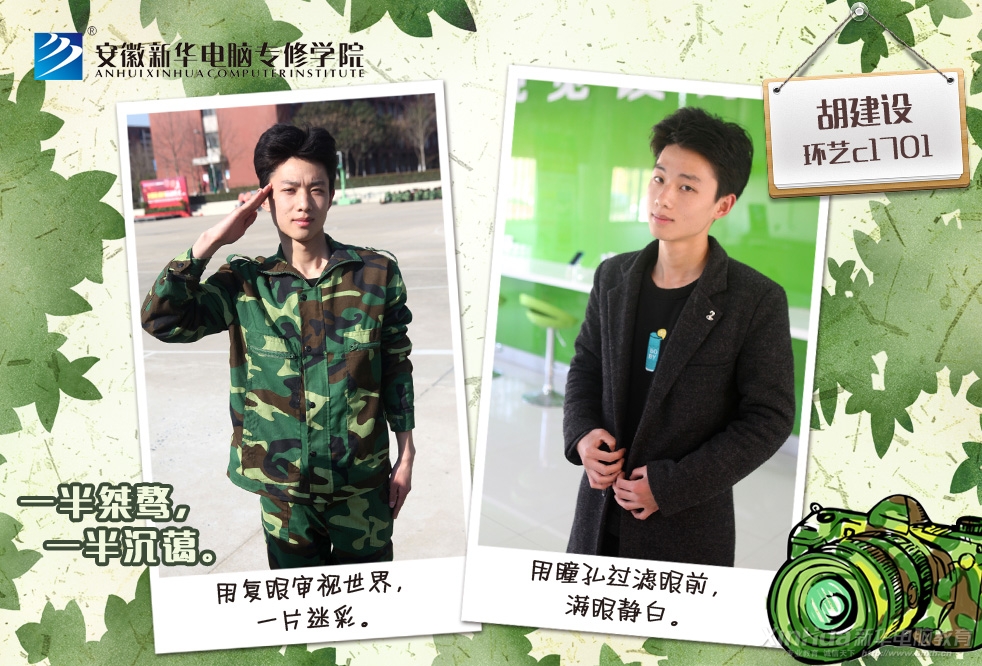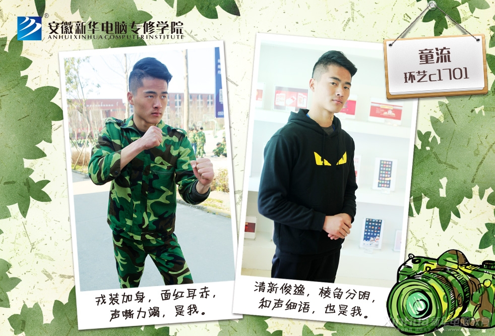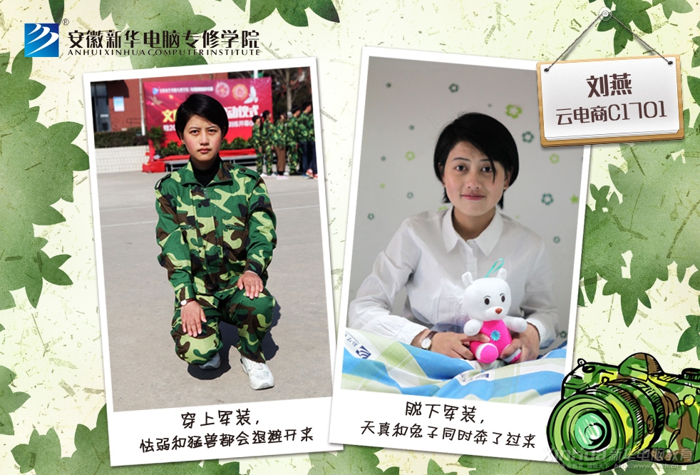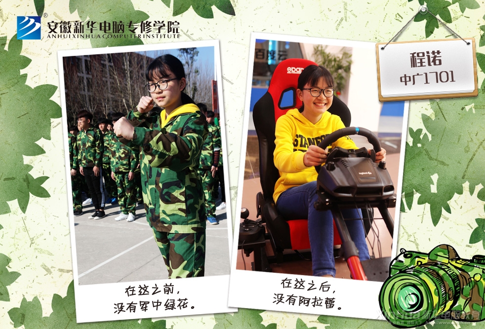 程诺说,每个人都会遇到一件事、一些人,让你顿然明白,原来我还可以这样。左边是英姿飒爽的军中绿花,右边是呆萌可爱的现实阿拉蕾,在安徽新华电脑专修学院,我就是不一样的我,程诺。